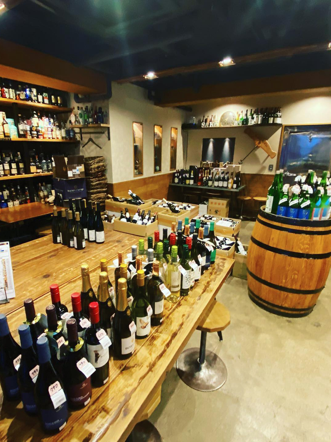 山崎坂店では角打ちの主流である立ち飲みスタイルとは一線を画し、テーブル席やカウンター席をメインとした落ち着きのある木造空間をご用意しております。時間を忘れてゆっくりと厳選された一杯と、オーナーお手製の絶品肴をお楽しみください。